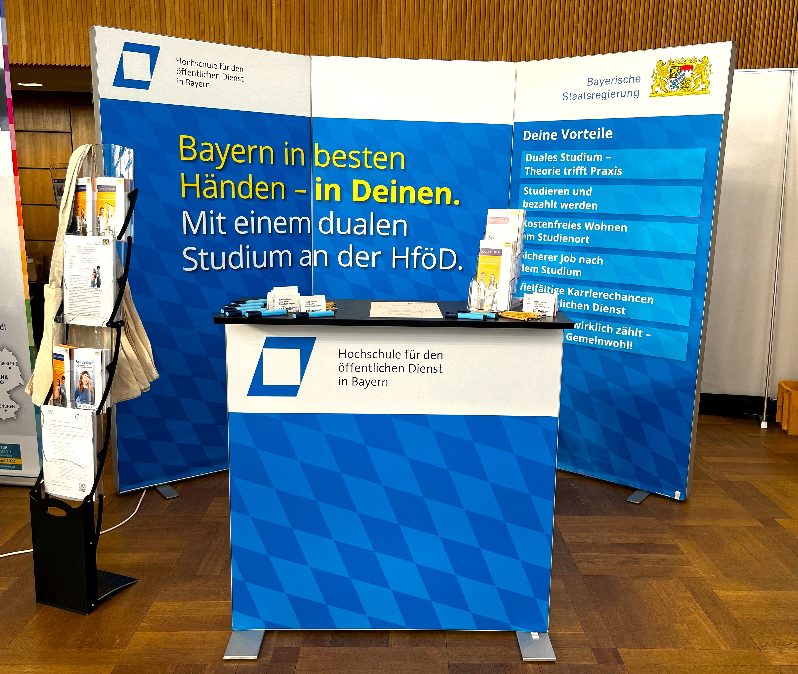 Die Hochschule für den öffentlichen Dienst ist 2025 auf vielen Studien- und Berufsmessen in ganz Bayern vertreten. Bestimmt kommen wir auch in eure Nähe! Besucht uns an unserem Messestand und informiert euch über die vielfältigen Studiengänge im öffentlichen Dienst. Das duale Studium an der HföD bietet eine ideale Balance von Theorie und Praxis, eine attraktive Vergütung von Anfang an und kostenfreie Unterkünfte an all unseren Studienorten.